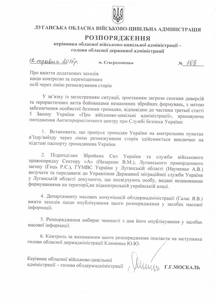 Глава Луганской областной военно-гражданской администрации Геннадий Москаль запретил проезд с оккупированной на контролируемую Украиной территорию и обратно лицам, предъявляющим в пунктах пропуска «паспорта или другую документацию самопровозглашенных ЛДНР. Соответствующее распоряжение обнародовано во вторник, 12 мая, на официальном сайте Москаля.